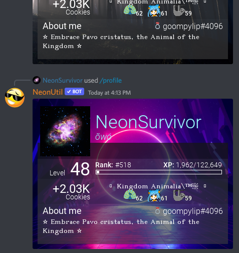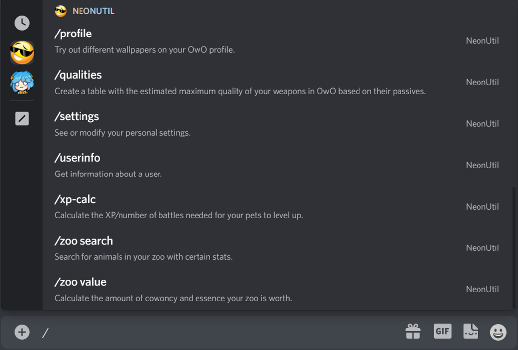 NeonUtil provides you with several customizable utilities to help you with OwO while keeping simplicity. You can use them with your favorite mode of input, whether that's slash commands (/