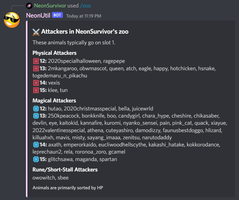 NeonUtil offers multiple ways to process your zoo seamlessly, such as helping you quickly build any team by organizing your animals by role.